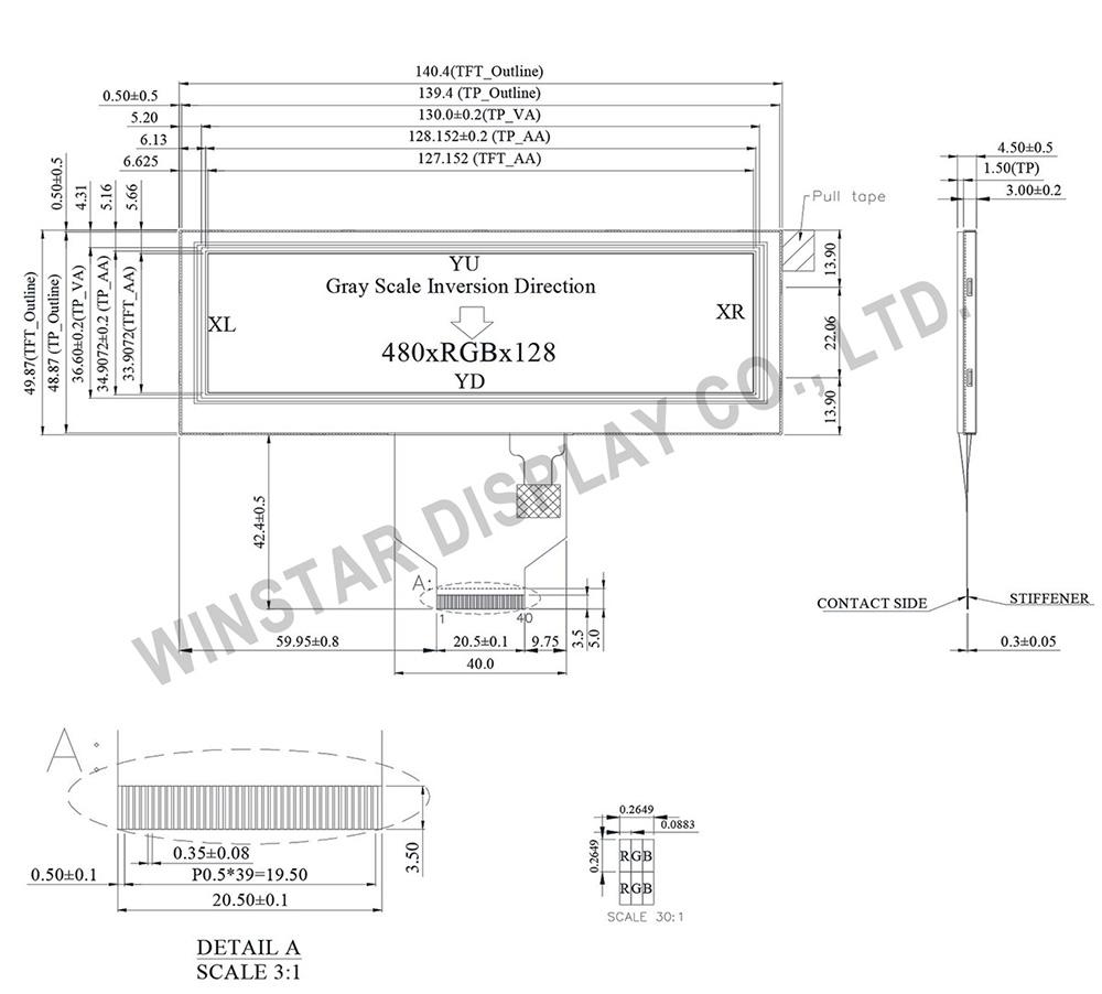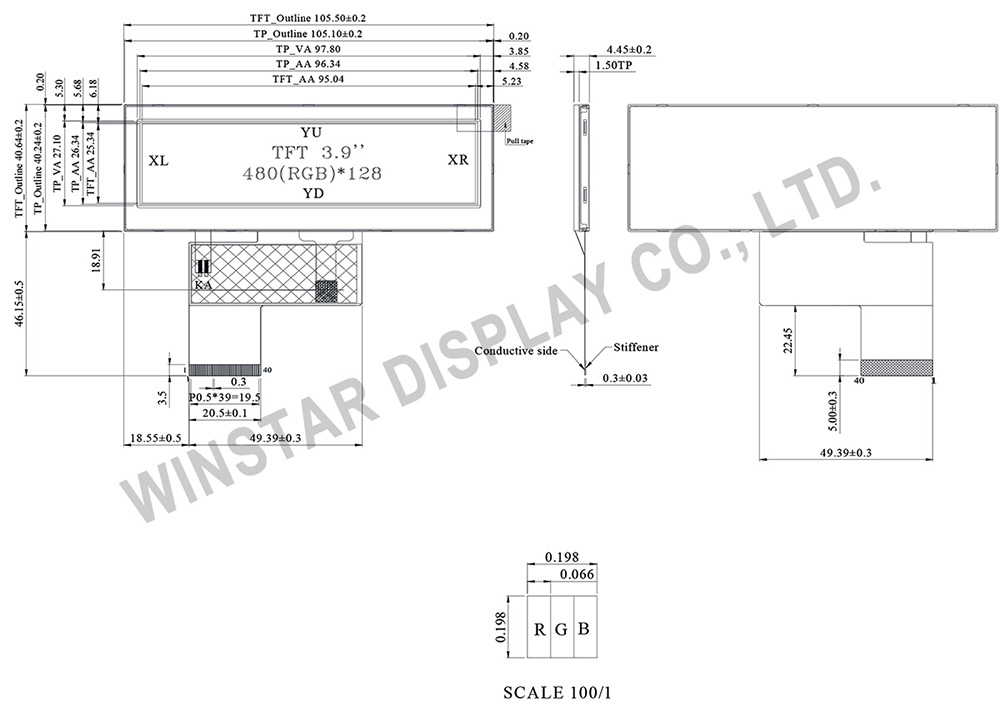WF39ATIASDNT0 is a Bar Type 3.9 inch color TFT display module made of resolution 480x128 pixels. This TFT LCD is integrated with a Resistive Touch Screen, having the module dimension of 105.5x40.64 mm and active area size of 95.04x25.34 mm. WF39ATIASDNT0 supports RGB interface, 3.3V (typical) power supply, supports DE mode and Sync mode. It's View Angle (U/D/R/L) is:50/70/70/70 (typical); brightness is 350 cd/m2.