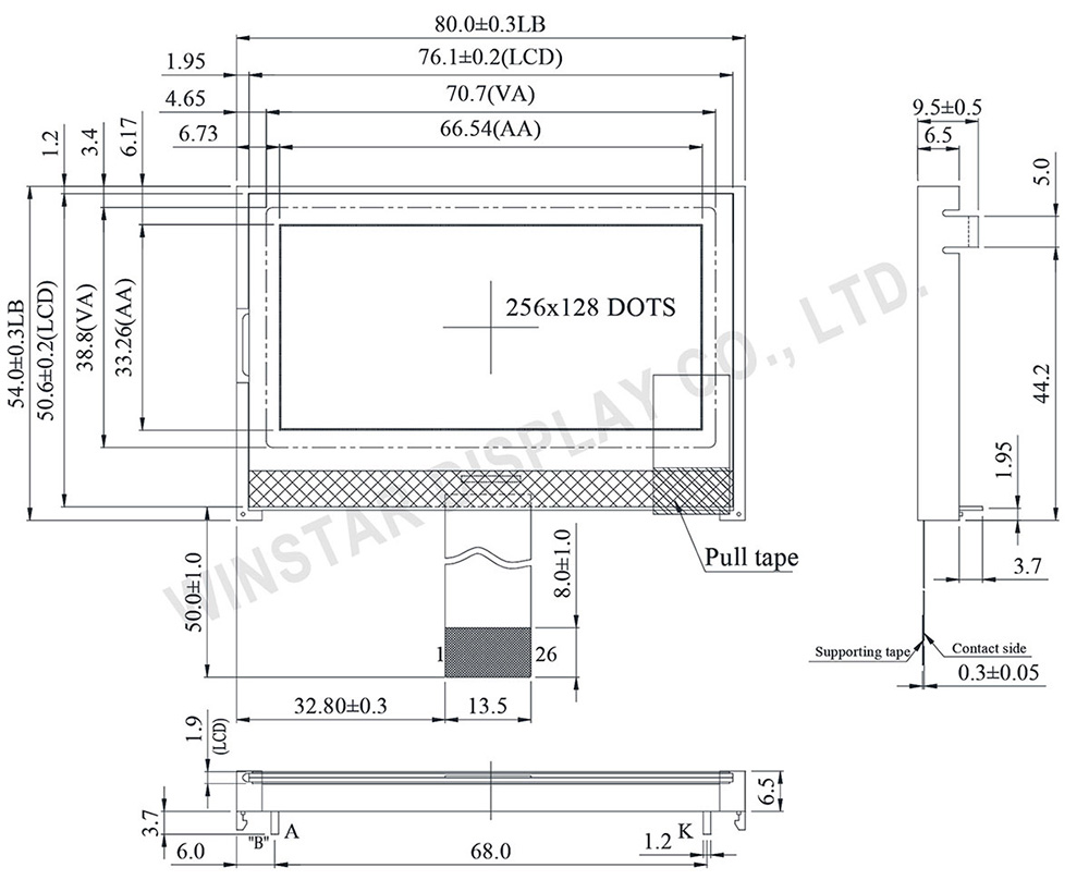 This module can be operating at temperatures from -20℃ to +70℃; its storage temperatures range from -30℃ to +80℃. The WO256128A is available for different LCD mode options, STN Negative, FSTN Negative (Double film) and FSTN positive and with LED backlight options, like white LED. Please contact with us if you need different LCD type and LED combination.