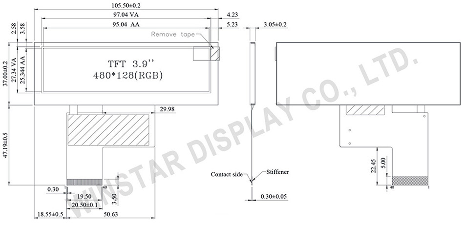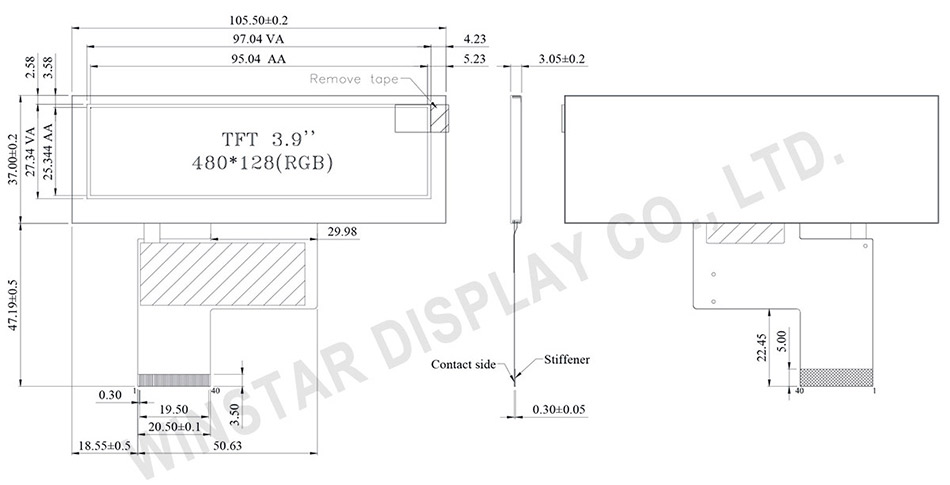 WF39BTZASDNN0 is Winstar 3.9" Bar type WF39B series TFT display with O-Film technology on module. This WF39BTZASDNN0 is featured with resolution 480x128 pixels and wider view angle; built in with Driver IC HX8278, it supports RGB interface; 3.3V (typical) power supply; supports Sync mode and DE modem, default Sync mode. Its luminance is 400 Nits (typical); Contrast ratio of 500:1, gray scale inversion direction 12 o'clock. It can be operating at temperatures from -20℃ to +70℃; its storage temperatures range from -30℃ to +80℃.