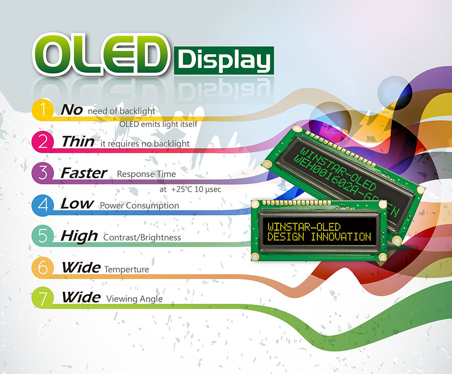 La technologie OLED sera la prochaine génération utilisée pour les afficheurs. Les OLEDs ont reçu depuis des années une attention particulière à travers le monde comme la prochaine génération d'afficheurs. Les OLEDs offrent des avantages réels en comparaison avec les technologies LCD ou VFD : En effet, les OLEDs présentent beaucoup d'avantages qui sont rappelés ci-dessous :
