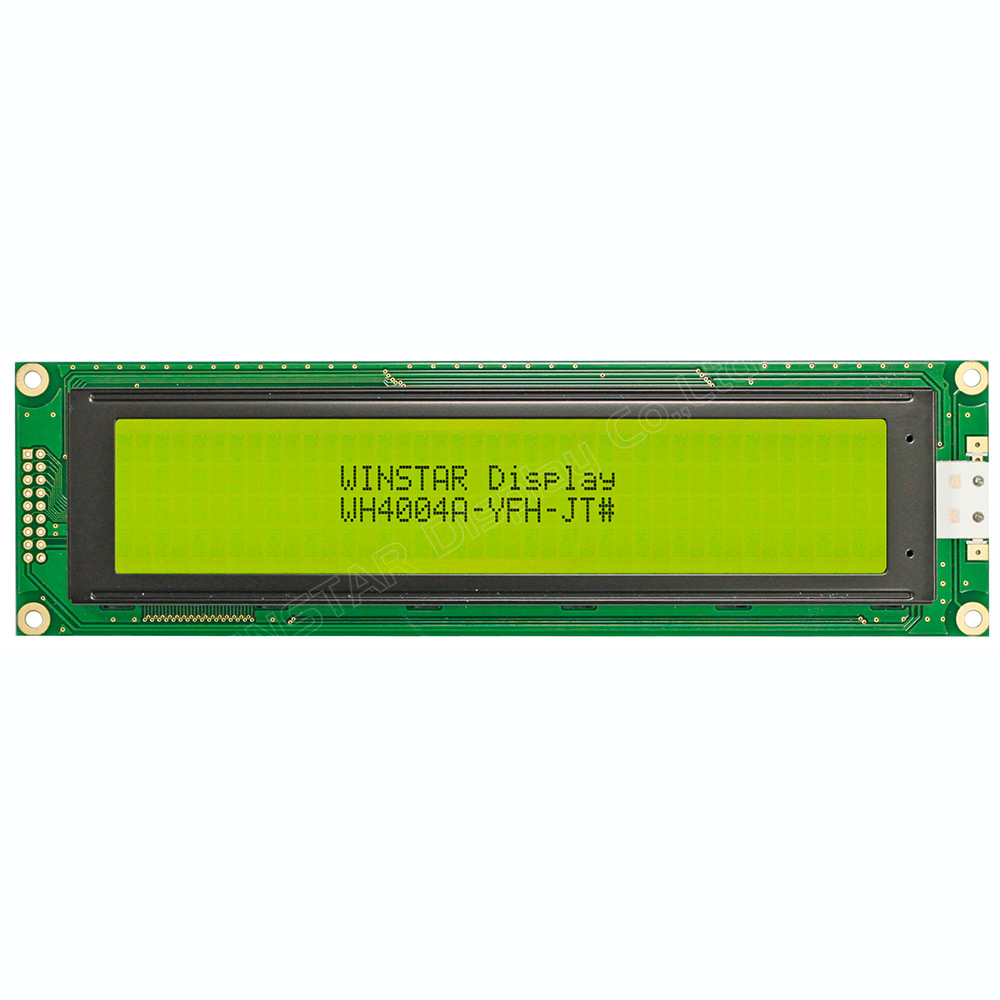 WH4004A is 40x4 Character LCD display module which is built in with ST7066 controller IC; its default interface is 6800 4/8-bit parallel and 5V or 3.3V power supply option. This 40x4 LCD display WH4004A is available for no backlight or with LED backlight options. This LCD display 40x4 is available in various LCD panel colors including gray, yellow/green and blue LCD options. This display LCD 40x4 module can be operating at temperatures from -20℃ to +70℃; its storage temperatures range from -30℃ to +80℃, its built in character set supports English/Japanese, English/West European, English/Scandinavian European, or English/Cyrillic (Russian) options.