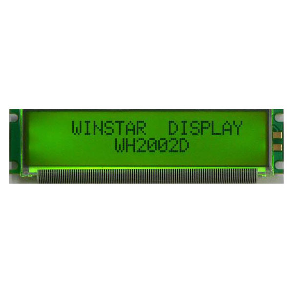 WH2002D is a Character LCD 20x2 display which is built in with ST7066 controller IC; its default interface is 6800 4/8-bit parallel, +5Vpower supply. WH2002D modules are also available in SPI and I2C interface by using RW1063 controller IC. It is available in several different backlight colors including blue, green, white, yellow-green, amber, red and white LEDs. There are different character fonts/texts available for ST7066 IC including English/Japanese, English/West European, English/Scandinavian European, or English/Cyrillic (Russian) as options. This module can operate at temperature from -20℃ to + 70℃; its storage temperature ranges from -30℃ to + 80℃.