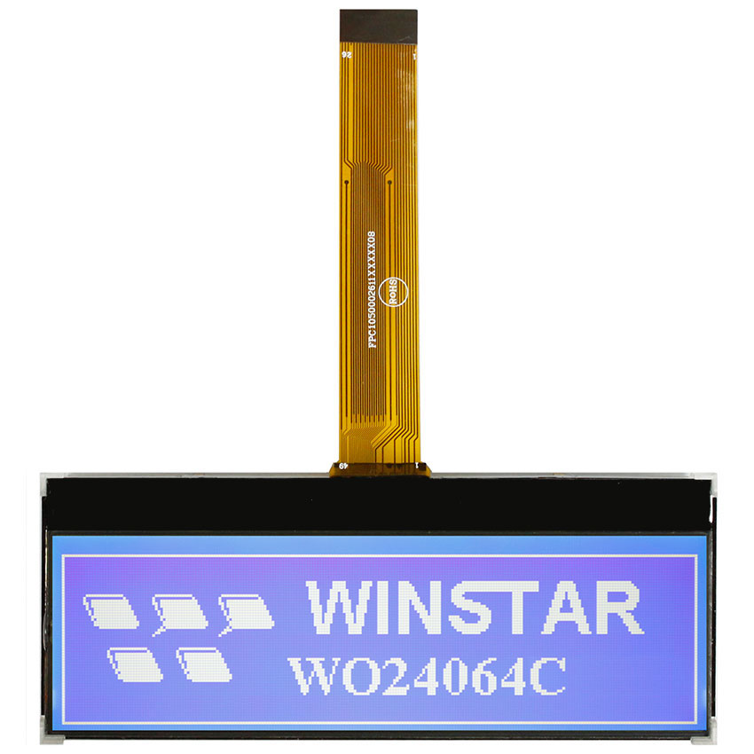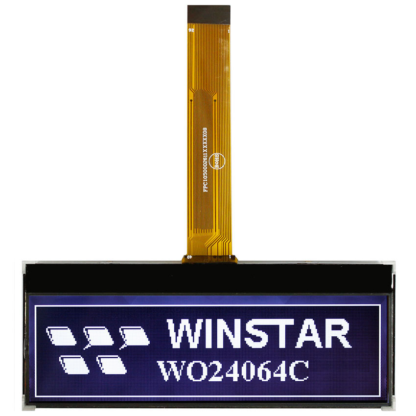 Winstar standard COG 240 x 64 graphic LCD modules; LCD display WO24064C is built in with ST7586S IC which supports 6800/8080, 4 Line SPI or 3 Line SPI (optional) interface. The display is having the outline dimension 111.4 x 45.5 mm and AA size of 103.17 x 27.49 mm. This LCD module can be operating at temperatures from -20℃ to +70℃; its storage temperatures range from -30℃ to +80℃.