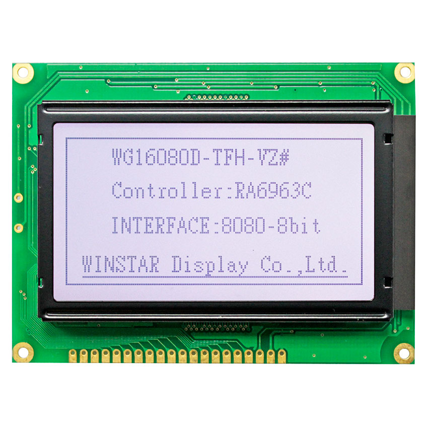 WG16080D is a monochrome LCD 160x80 dot matrix display module which is having the module dimension of 93x70 mm and AA size of 66.17x33.57 mm; diagonal size 3 inch LCD Display. This WG16080D model is built in with RA6963 controller; it communicates via 8080 8-bit parallel interface; 5V power supply negative voltage . This module is available for graphic mode or Character Generator mode (Character font) optional. It can be operating at temperatures from -20℃ to +70℃; its storage temperatures range from -30℃ to +80℃.