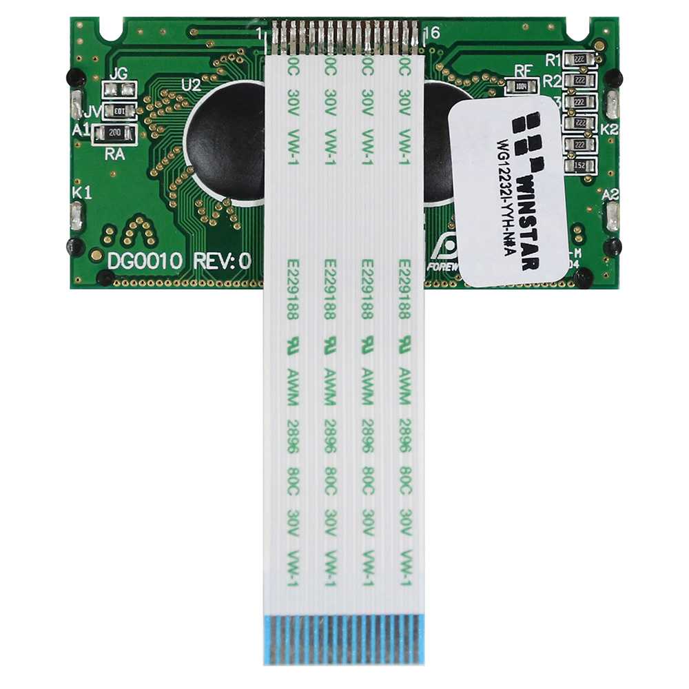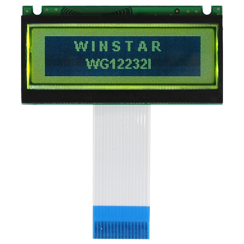 WG12232I model is a COB Graphic LCD module made of 122x32 dots, diagonal size 1.9 inch. This display is built in with SBN1661G controller IC or compatible controller. It supports 6800 8-bit parallel interface; 5V power supply. WG12232I have the same mechanical size as WG12232D, but with FFC pinout on module. WG12232I is available for different LCD mode options, STN Negative, FSTN Negative and FSTN Positive and with LED backlight options, like yellow/green, blue LED. Please note, WG12232I is not available for White LED backlight.