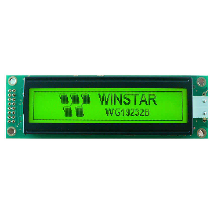 WG19232B is a monochrome graphic 192x32 LCD module. This display is having the module dimension of 116x37 mm and AA size of 80.6x15.96 mm. This WG192x32B model is built in ST7920 controller IC, it supports 6800 8-bit parallel and SPI interface; 5V power supply. WG19232B is available in various LED colors including yellow/green, blue, white, red, etc, the LED can be drive by PIN 15, PIN16. The WG19232B model supports Traditional Chinese and Simplified Chinese Font on module. It can be operating at temperatures from -20℃ to +70℃; its storage temperatures range from -30℃ to +80℃.