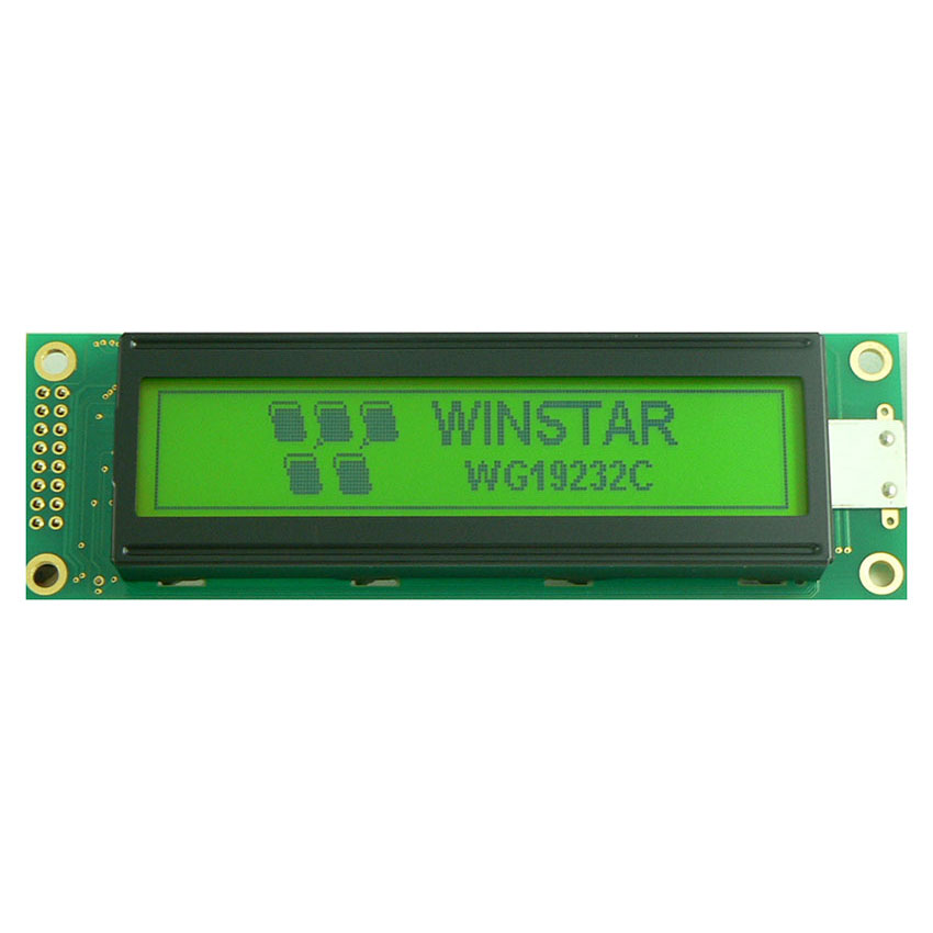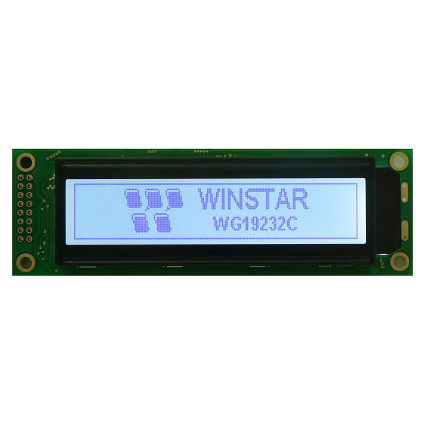 WG19232C is a monochrome graphic 192x32 LCD module, diagonal 3.2” LCD display. This display is having the module dimension of 116x37 mm and AA size of 80.6x15.96 mm which is having the same mechanical size as WH2002A. This WG192x32C model is built in ST7920 controller IC, it supports 6800 8-bit parallel and SPI interface. WG19232C3 is 3.3V power supply; WG19232C5 is 5V power supply. WG19232C is available in various LED colors including yellow/green, blue, white, red, etc, the LED can be drive by PIN 15, PIN16. The WG19232C model supports Traditional Chinese and Simplified Chinese Font on module, if you need a same size module as WH2002A and need Chinese version, please choose this model. It can be operating at temperatures from -20℃ to +70℃; its storage temperatures range from -30℃ to +80℃.