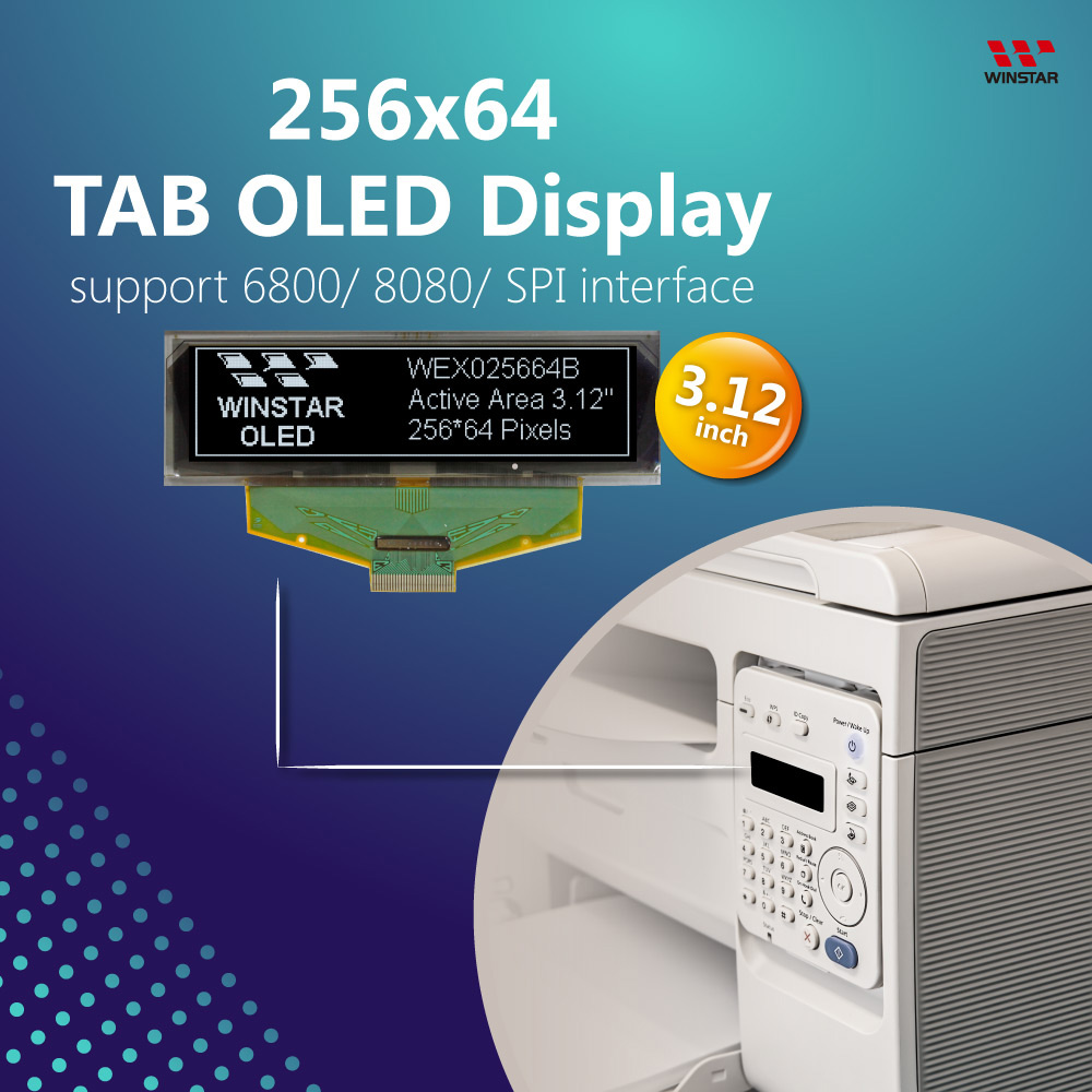 The model WEX025664B is Winstar COF 3.12 inch of standard OLED graphic display. This 256x64 OLED display is built-in SSD1322 driver IC which the outline dimension of 88 x 27.8 mm, AA size 76.778 x 19.178 mm. Winstar COF Series are suitable for wall / meter devices, home applications, POS system, Cloud/IoT system, handheld instruments, intelligent technology devices, energy systems, automotive, communication systems, medical instrument, etc. Customers can upgrade your current applications from traditional STN displays to OLED displays since Winstar provides a very wide range of dot pixel formats OLED solutions.