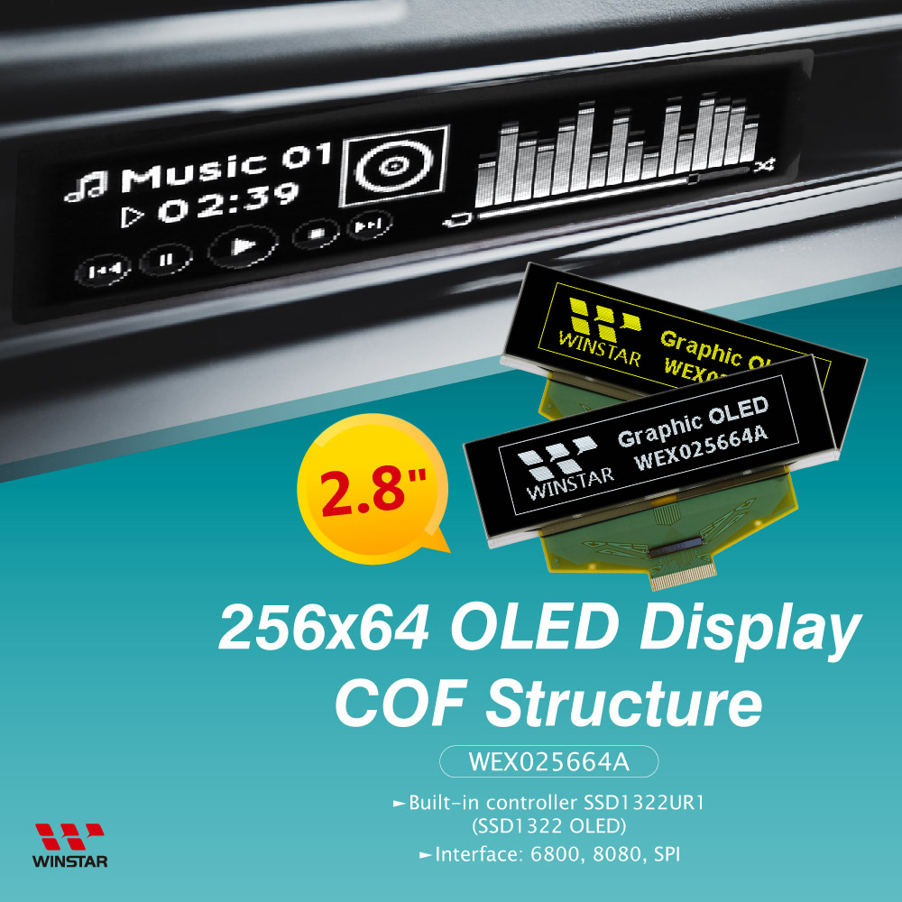 Winstar 2.8 inch OLED Display Module of 256x64 COF Graphic item no. WEX025664A is built-in SSD1322 IC which with the outline dimension of 84.0 x 25.8 mm, AA siez of 69.098 x 17.258 mm. Winstar COF Series are suitable for wall / meter devices, home applications, POS system, Cloud/IoT system, handheld instruments, intelligent technology devices, energy systems, automotive, communication systems, medical instrument, etc. Customers can upgrade your current applications from traditional STN displays to OLED displays since Winstar provides a very wide range of dot pixel formats OLED solutions.