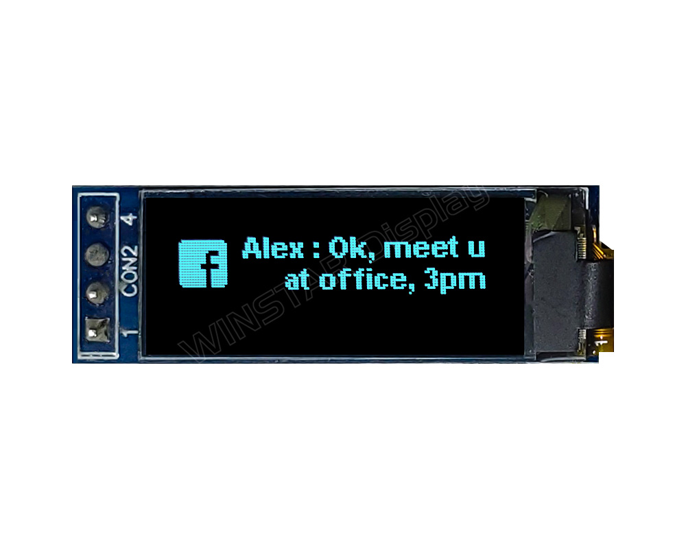 WEA012832F is a graphic COG with PCB OLED module, which is made of resolution 128x32 pixels, diagonal size 0.91 inch. WEA012832F is built in with SSD1306 IC; it supports I2C interface, 1/32 driving duty. WEA012832F model is having PCB outline size 35.80 × 12.0 mm with 4x1 metal pins on module.