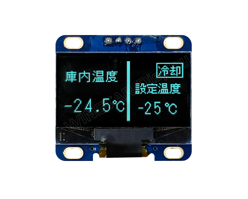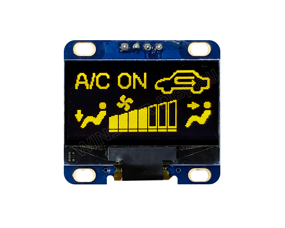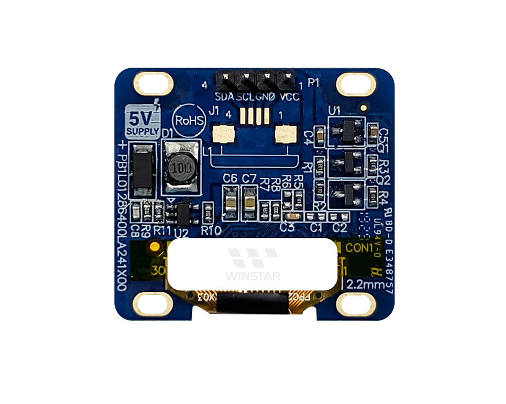 WEA012864L is a graphic COG with PCB OLED module, which is made of resolution 128x64 pixels, diagonal size 1.28 inch. WEA012864L is built in with SH1106 IC; it supports I2C interface, 1/64 driving duty. WEA012864L model is having PCB outline size 35.50 × 32.0 mm with mounting holes on board and 4x1 metal pins on module.