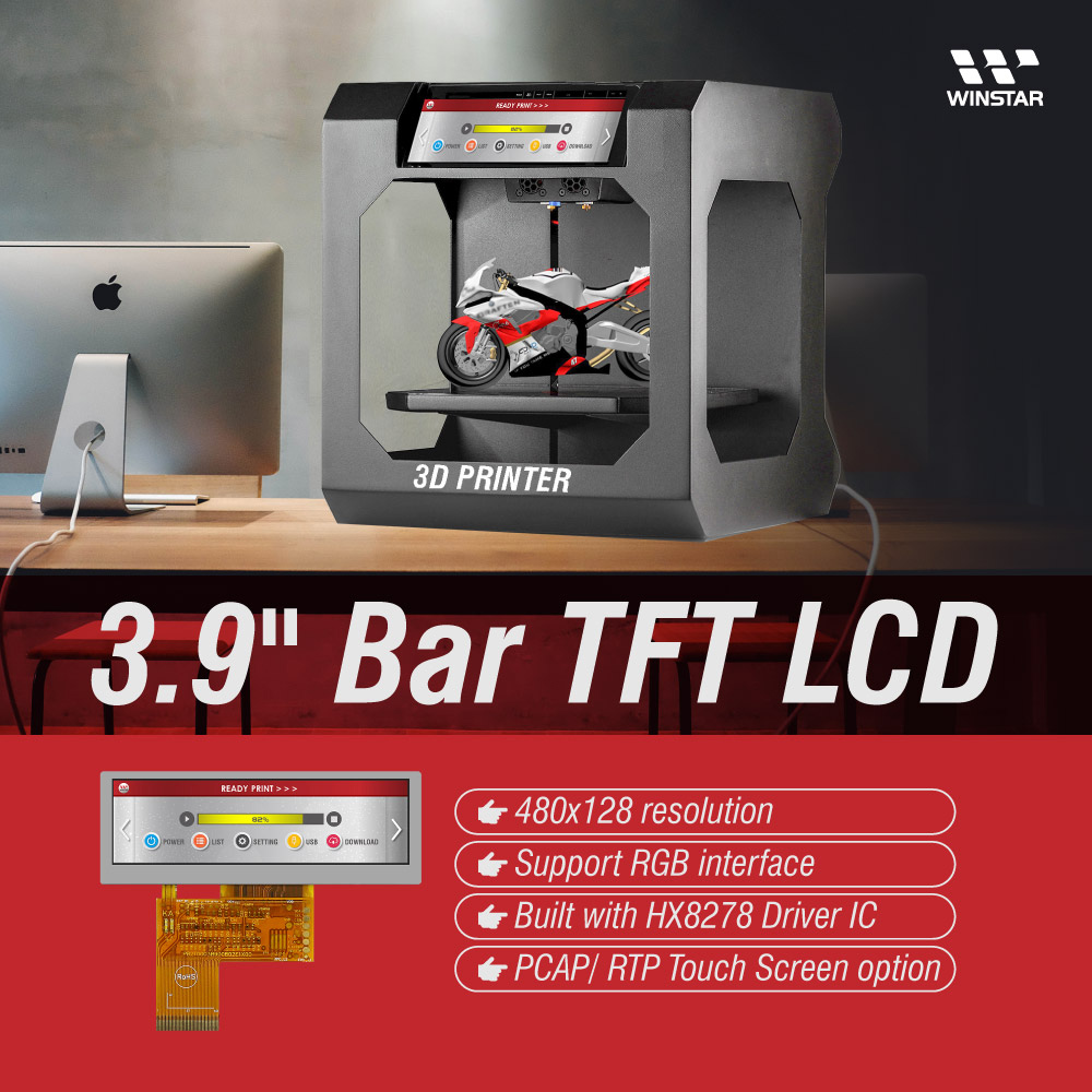 Winstar Display released a wholly new 3.9 inch Bar type color TFT LCD display with resolution 480x128 pixels. This panorama new 3.9" WF39B TFT-LCD display offers high quality and colorful image; it is especially suitable for server system, audio system and advertising display, auto/aviation/marine equipment, POP, security equipment, Industrial equipment, outdoor intercom systems and control panels, medical equipment, drone controls.