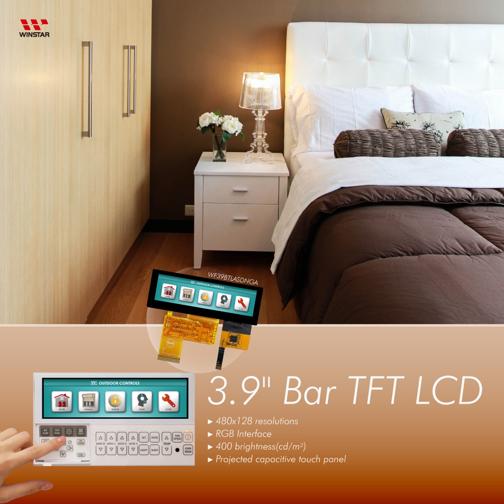 This panorama widescreen 3.9 inch WF39B TFT-LCD display offers high quality and colorful image; it is especially suitable for server system, audio system and advertising display, auto/aviation/marine equipment, security equipment, Industrial equipment, outdoor intercom systems and control panels, medical equipment, drone controls.