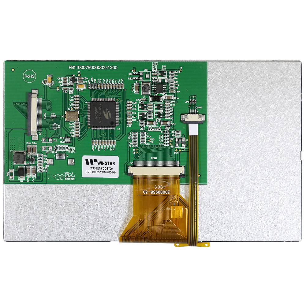This 7 inch TFT Display WF70QTIFGDBT0 is built in with SSD1963 controller board plus a 36 pin-out connector on board. This model is available in 8080 family MPU 8bit/16bit options and already defined pin no. 33 ~ 36 as backlight supply; so there is no need to design extra backlight circuit. This display is with the module dimension of 165 x 100 mm and including a RTP touch screen on module.