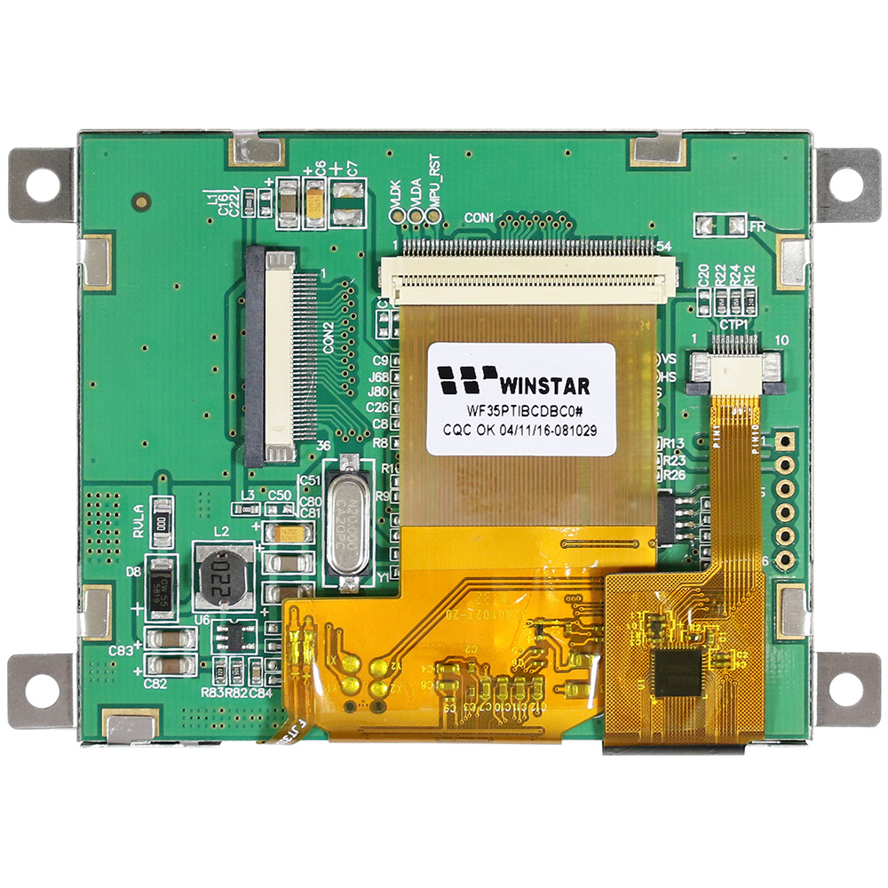 The WF35PTIBCDBCB is a 3.5 inch Winstar TFT P Series family with Projected Capacitive Touch Screen on module. The WF35PTIBCDBCB model is built in with RA8875 controller board plus an integrated 36 pin-out connector on board. All Winstar TFT P Series are built in with 8 bit or 16 bit parallel interface options and already pre-defined pin no. 33 ~ 36 as backlight supply; so there is no need to design extra backlight circuit. All of Winstar TFT P Series modules are built in backlight driver IC and support Chinese character, backlight brightness adjustment and Flash Memory.