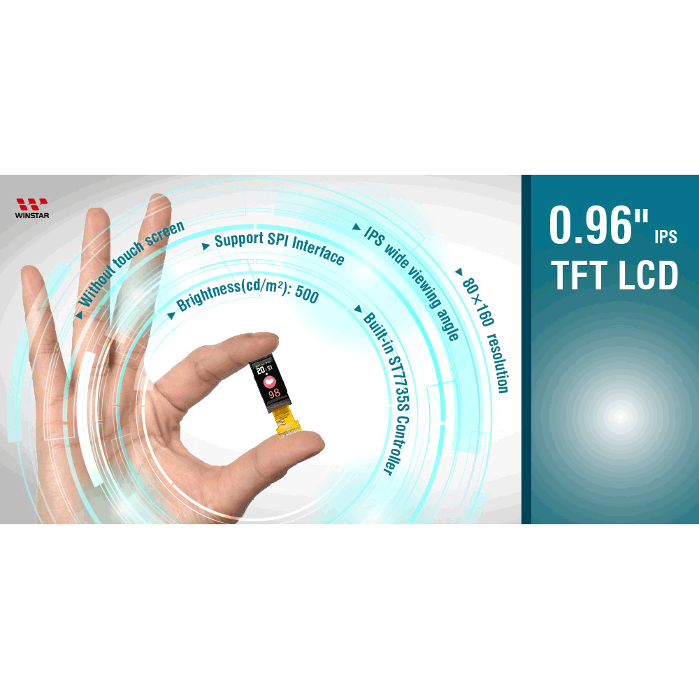 WF0096ATYAA3DNN0 is a 0.96 inch IPS Mini TFT LCD display module, resolution 80 x 160 pixels. This 0.96" TFT module is built-in with ST7735S controller IC, it supports 4-wire SPI interface, supply voltage (VCC) range is from 3.0V to 3.6V, with brightness 500 nits (typical value), contrast ratio 800.