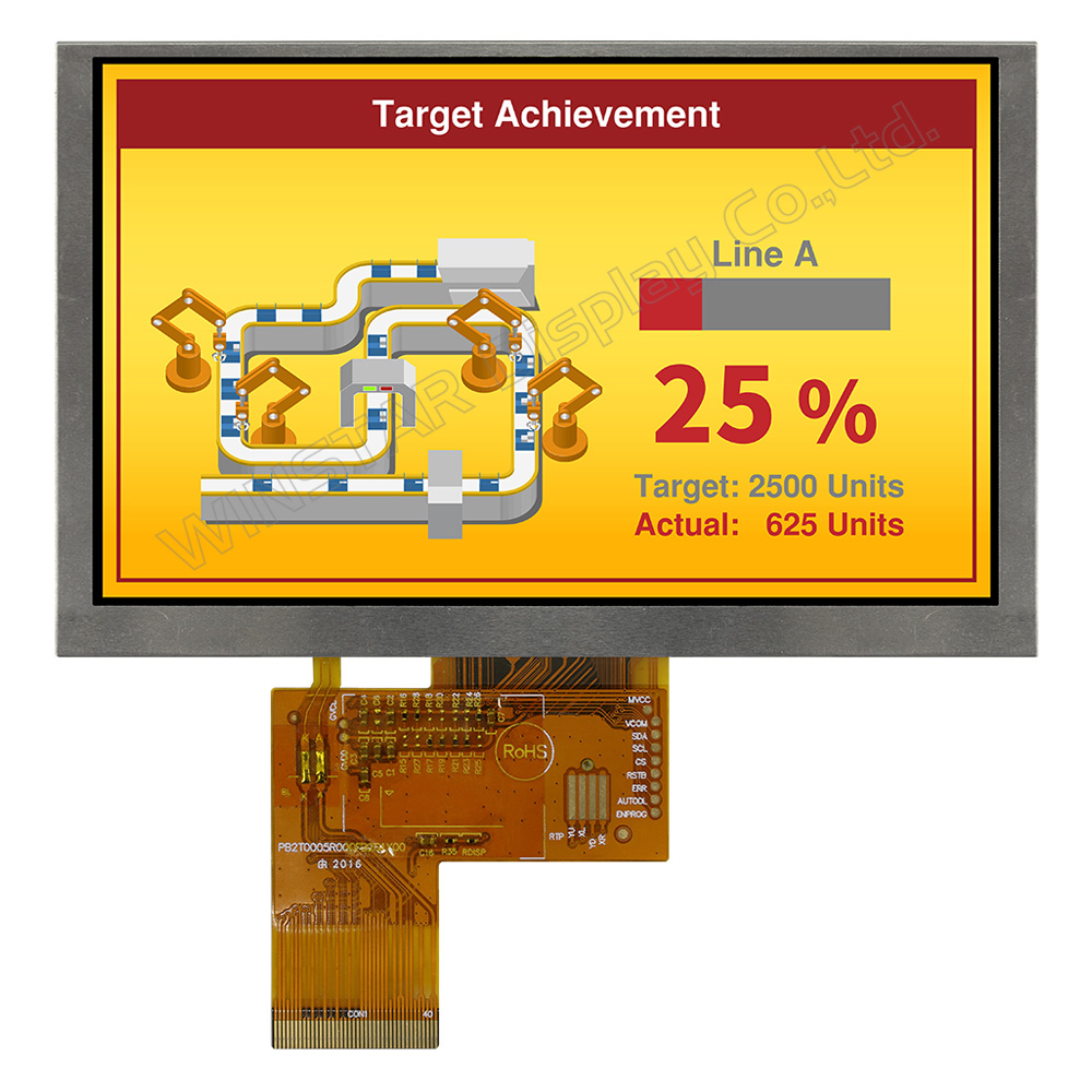 This 5" IPS TFT has a wider viewing angle than TN TFT, the view angle is Left:80 / Right:80 / Up:80 / Down:80 degree (typical value). The power voltage of WF50F model is from 3.1 to 3.6V, typical value 3.3V, aspect ratio 16:9, normally black, transmissive LCD type, anti-glare surface glass. It can be operating at temperatures from -30℃ to +80℃ and storage temperatures from -30℃ to +80℃. WF50F have Resistive Touch Panel and Projected Capacitive Touch Panel for optional.