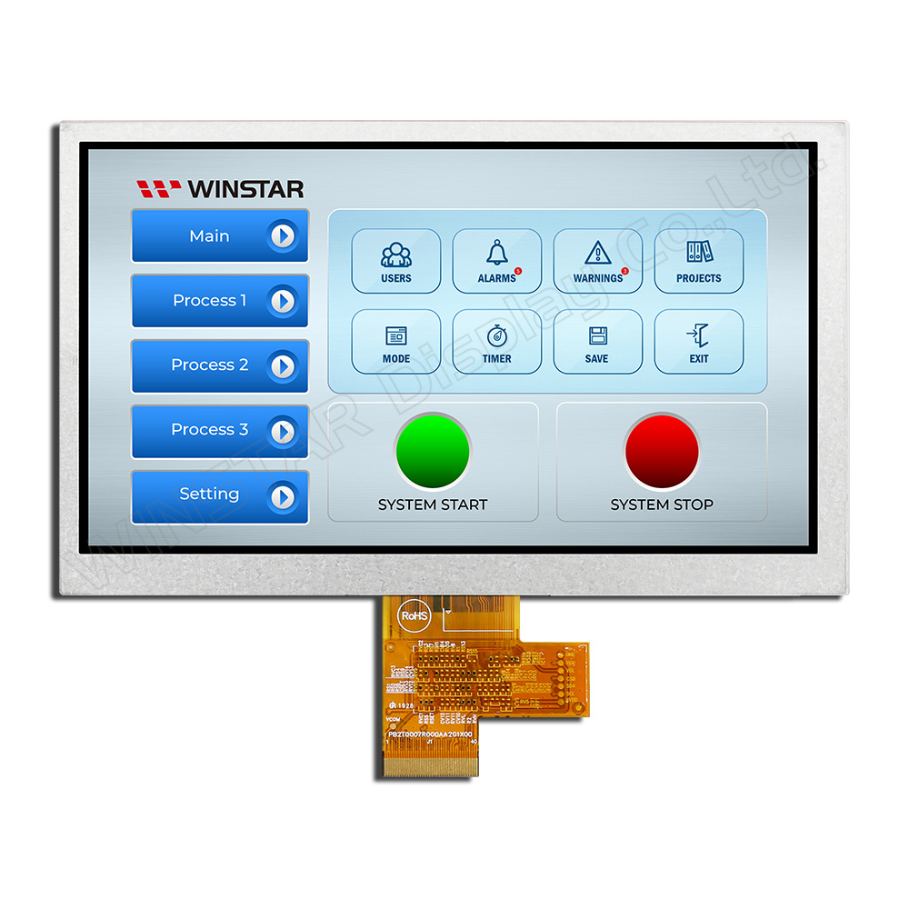 The supply voltage (VDD) of WF70A8SYAHLNN0 is from 3.0V to 3.6V, typical value 3.3V. It can be operating at temperatures from -20℃ to +70℃ and storage temperatures from -30℃ to +80℃. We also offer Resistive Touch Panels (RTP), Projected Capacitive Touch Panel (PCAP) optional for WF70A8 model.