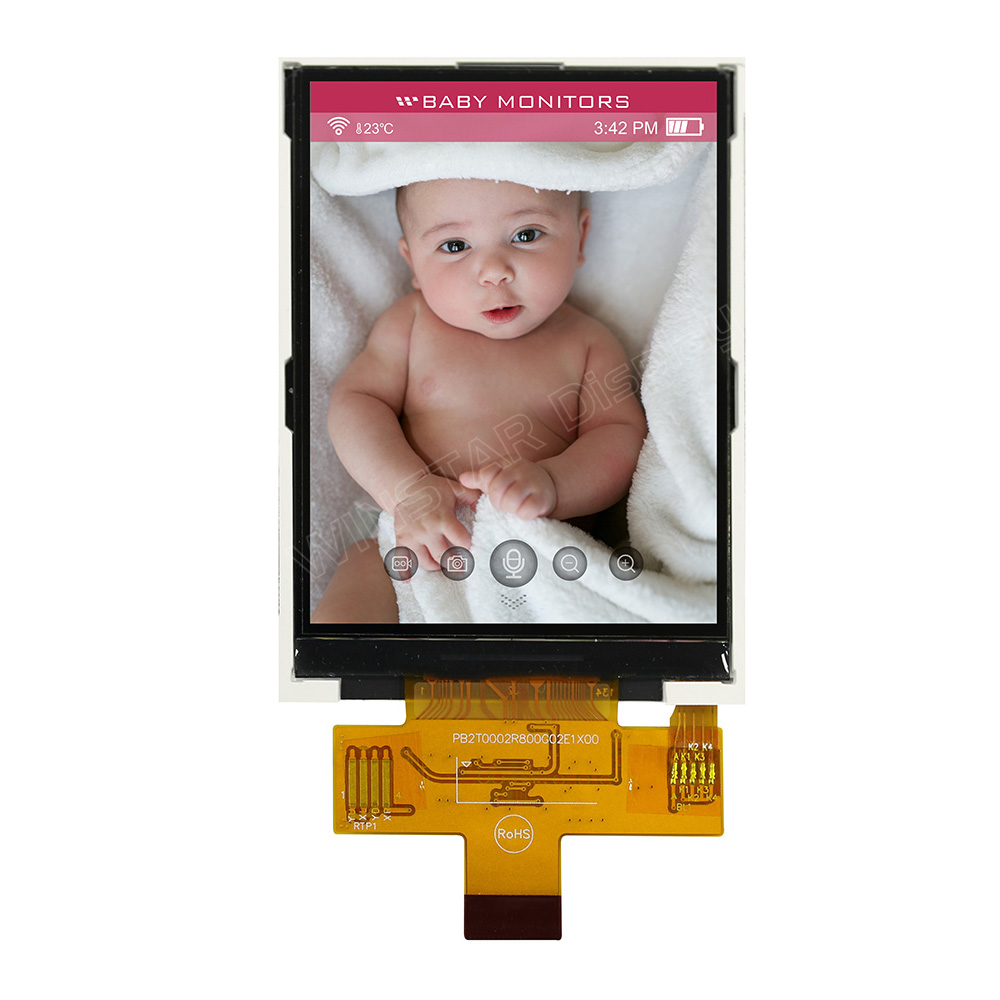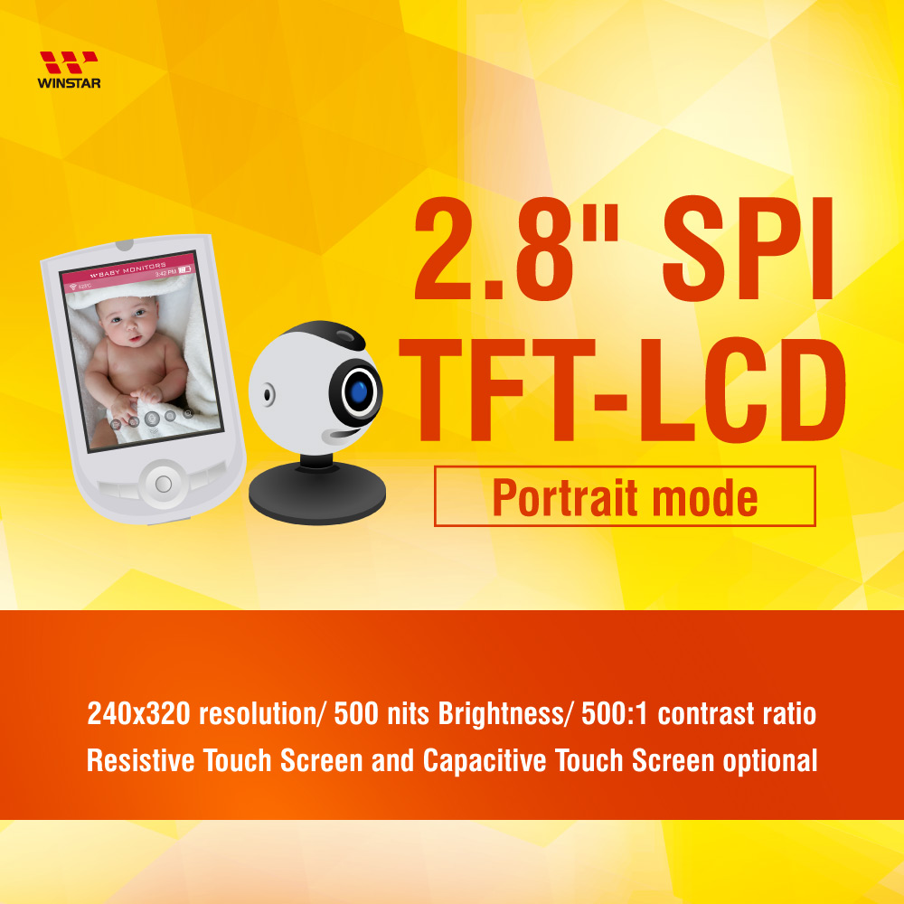 WF28GTLAJDNN0 is Portrait mode with brightness 500 nits (typical value), this model is Resistive Touch Screen (RTP) and Capacitive Touch Screen (CTP) optional. WF28G can be operating at temperatures from -20℃ to +70℃, its storage temperatures range from -30℃ to +80℃. It is ideal for mp4 players, security door system, mini audio player, and baby monitor, etc.