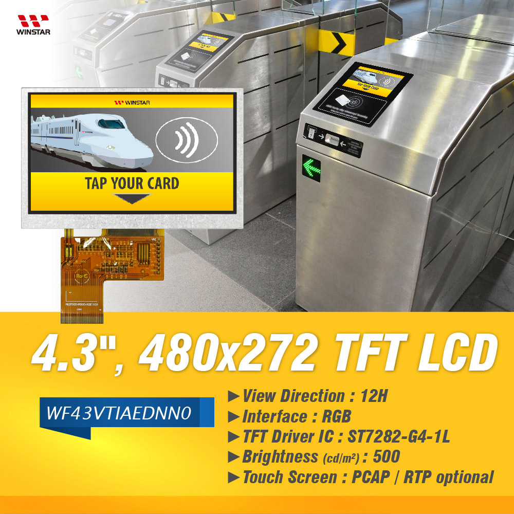 WF43VTIAEDNN0 is a color TFT LCD with WQVGA 480x272 resolution, diagonal size 4.3 inch. This TFT model is built in with ST7282 driver IC. WF43VTIAEDNN0 supports 24-bit RGB interface; it’s available for Resistive Touch Screen (RTP) and Projected Capacitive Touch Screen (CTP) optional, as well as high brightness option for this model. WF43VTIAEDNN0 is an alternative item to replace WF43HTIAEDNNB which adopted CPT (Chunghwa Picture Tubes Ltd) TFT panel.