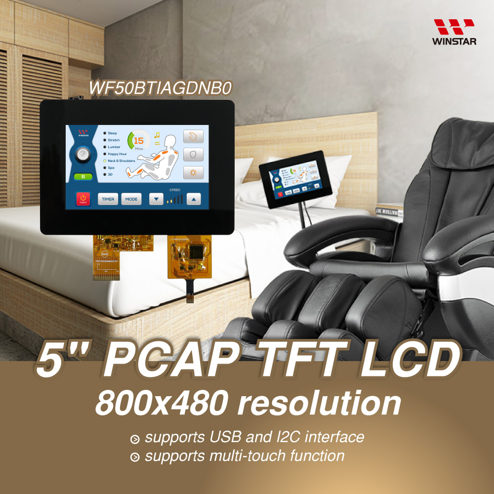 WF50BTIAGDNB0 is a full color 800x480 TFT-LCD display module, diagonal size 5 inch. This TFT model is featured with USB interface Capacitive Touch Screen on module; it built in with ILI6122 and ILI5960 Driver IC, supports 24-bit RGB interface, as to the capacitive touch panel is built in with ILI2511 driver IC which supports USB and I2C interface. This projected capacitive touch screen supports multi-touch function, compatible with Windows, Linux, Android and Mac operating systems.