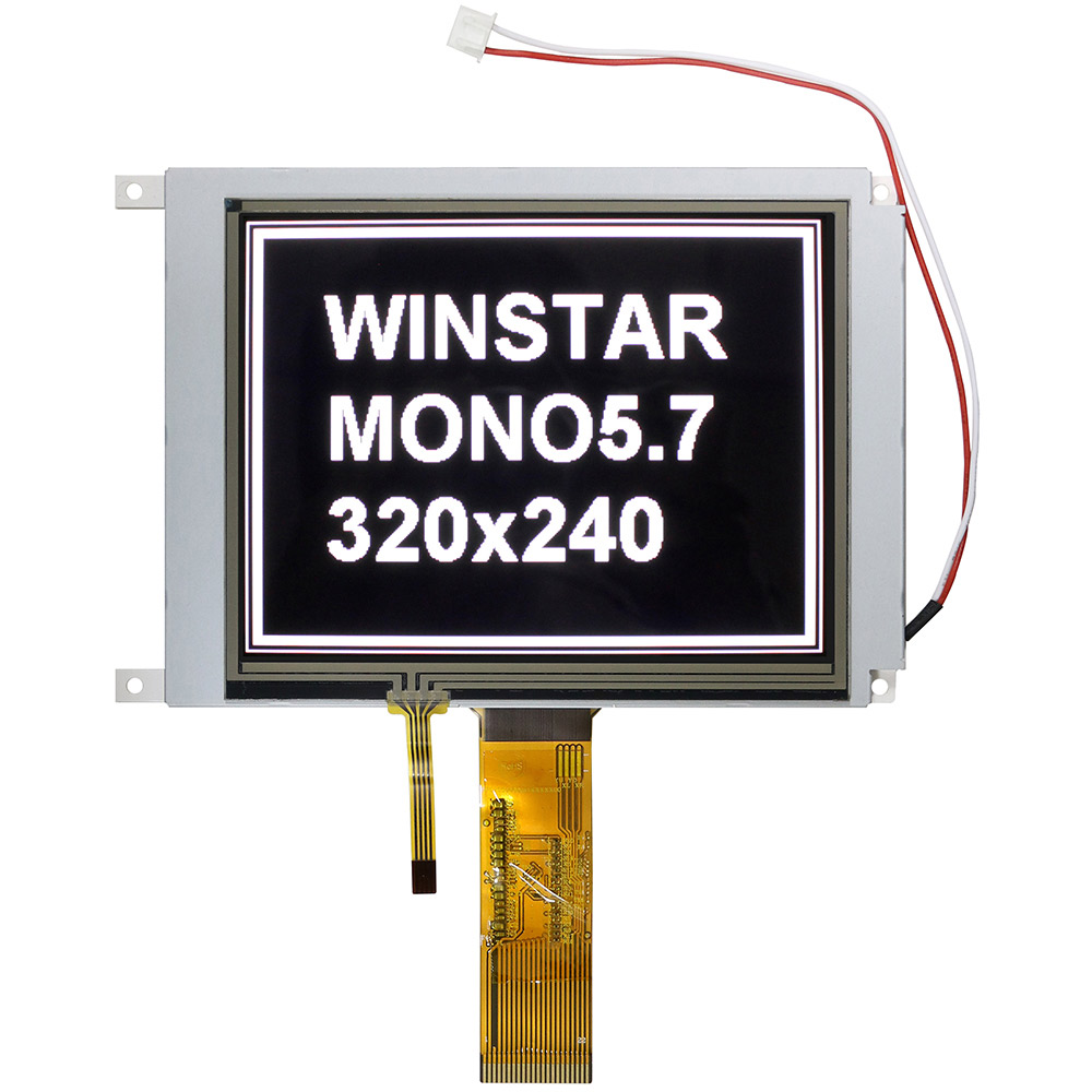 The model Winstar WF57S is a 5.7 inch Monochrome TFT Display 320x240. The external dimensions of the display is 160 x 109 x 7 mm (COG construction), and the active area is 115.2 x 86.4 mm. What is important, it is a TFT monochrome model with TN positive LCD, but applied in the active matrix TFT, which allows for high contrast (800:1), high brightness 1000 cd/m2 and short response times. In short, the mono TFT display performance is much better on contrast, brightness and response time than traditional monochrome LCD module.
